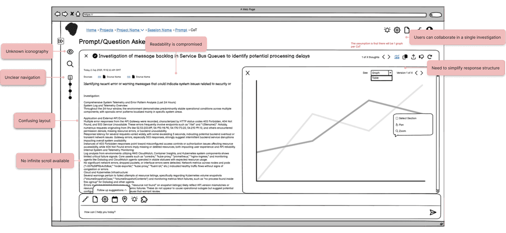 We started with a functional tool and an existing design system, but the complexity of the agent’s investigations made the UX difficult to follow. Each prompt could generate multiple investigations, each with its own summary, plus an overall summary on top. Users struggled to navigate this layered timeline and runbook behavior.